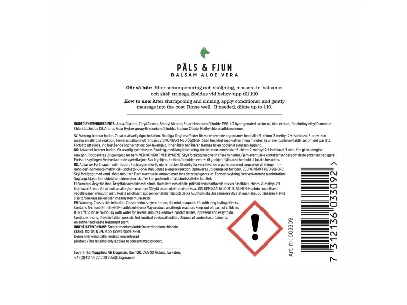 Återfuktande hundbalsam med Aloe Vera. Detta balsam är mycket fuktgivande, ger fin lyster till pälsen och återställer balansen i huden. Rekommenderas till alla hundar efter schamponering.
