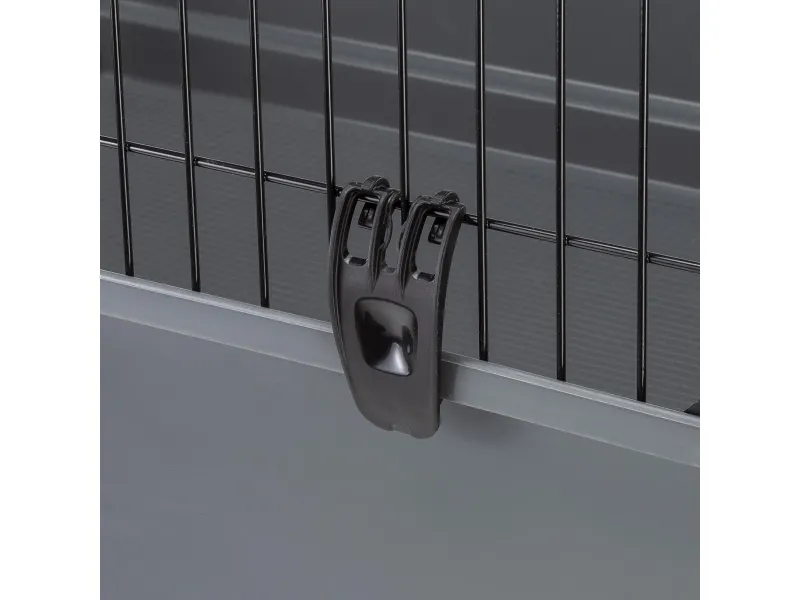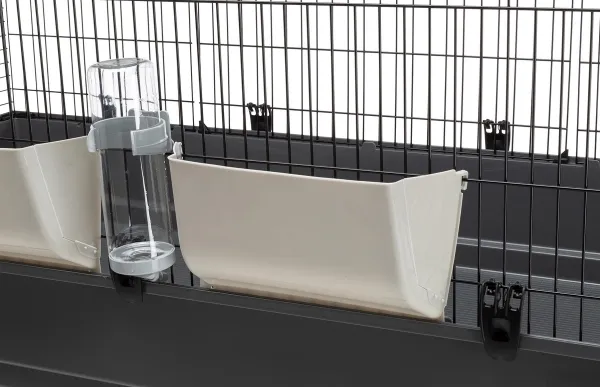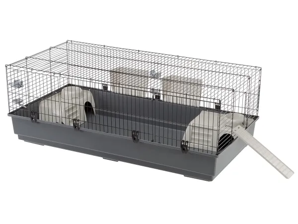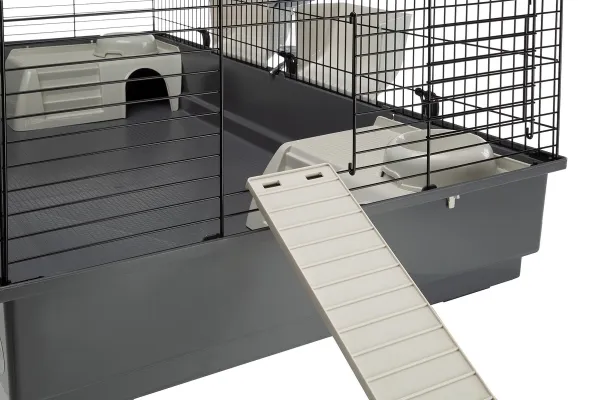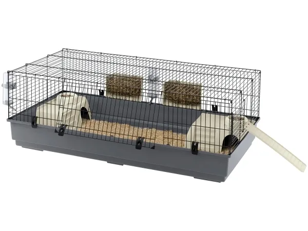 Bur för marsvin och dvärgkaniner (max 2kg). Smidiga snabbfästen för botten samt stora öppningsbara sektioner på ena sidan. Ink. 2st vattenflaskor, 2st höhäckar, 2st hus, 2st matskålar och en stege.
