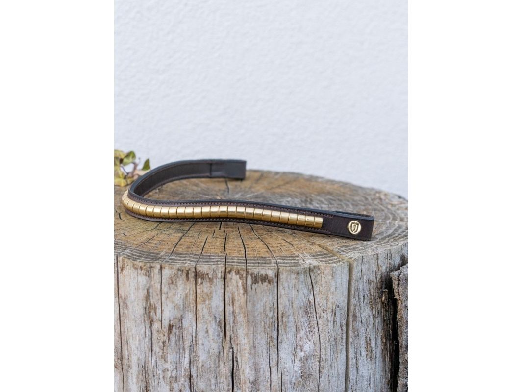 Svängt pannband i vegetabiliskt garvat läder med stora klinkers i mässing. Smakfullt och stilrent för att ge de små extra detaljerna.Ponny - 38cmCob - 40cmFull - 42cmX-Full - 44cm