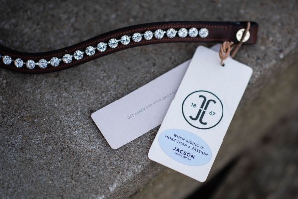 Svängt pannband i brunt läder med stora silverfärgade stenar. Längd Cob: 40 cm Längd Full: 42cm