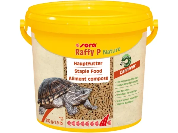 Flytande pellets. Huvudfoder för vatten- och sumpsköldpaddor. Innehåller naturligt levandefoder och vegetabilier, tillräckliga mängder kalcium, vitaminer och aminosyror. Sköldpaddorna bör utfodras med alternerande sera Raffy P och sera Raffy I.