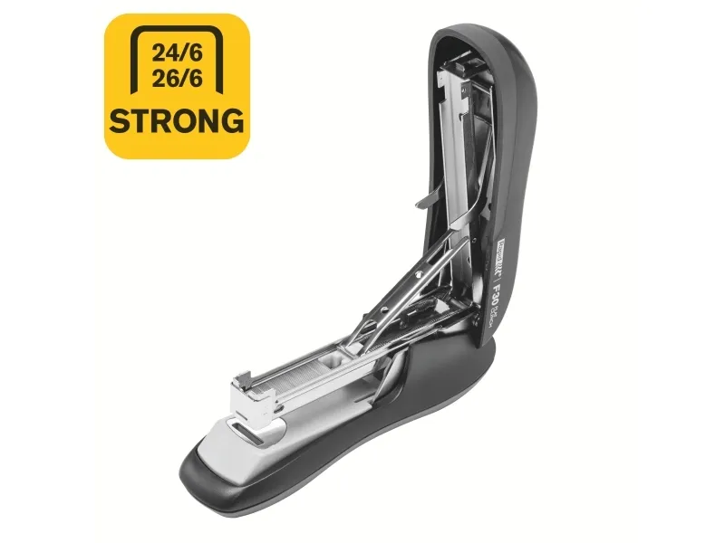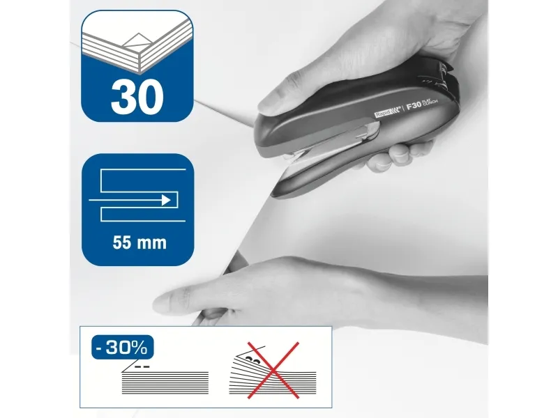 Ergonomisk halvstapelhäftare med Flat Clinch-teknik och stålkonstruktion för perfekt häftning. Flat Clinch-funktionen minskar utrymmesbehovet genom att göra pappersbuntarna 30 procent tunnare. Samma design som hålslaget FC30.
