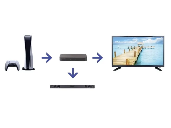 lydadapterSP-HDA-501 er en video-audio-adskilt konverter med to HDMI-udgange, en til TV 4K@60/HDR video- og lydsignaler og en til SoundBar til Dolby atmos eller Dolby 5.1 CH førsteklasses surround sound.