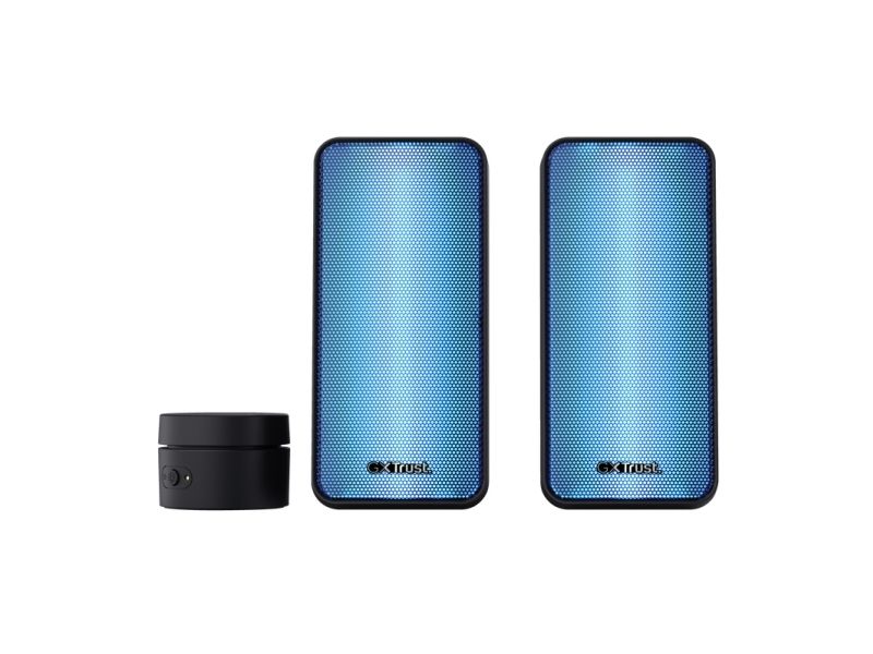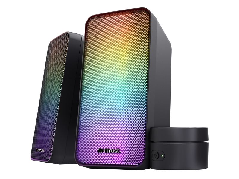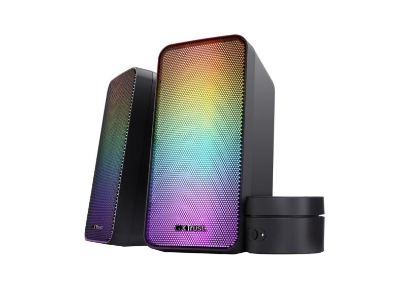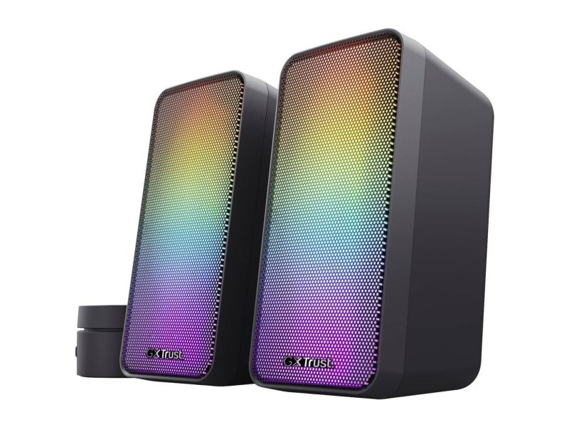 "See" the sound with this stylish speaker set featuring pulsating RGB lighting and clear sound.