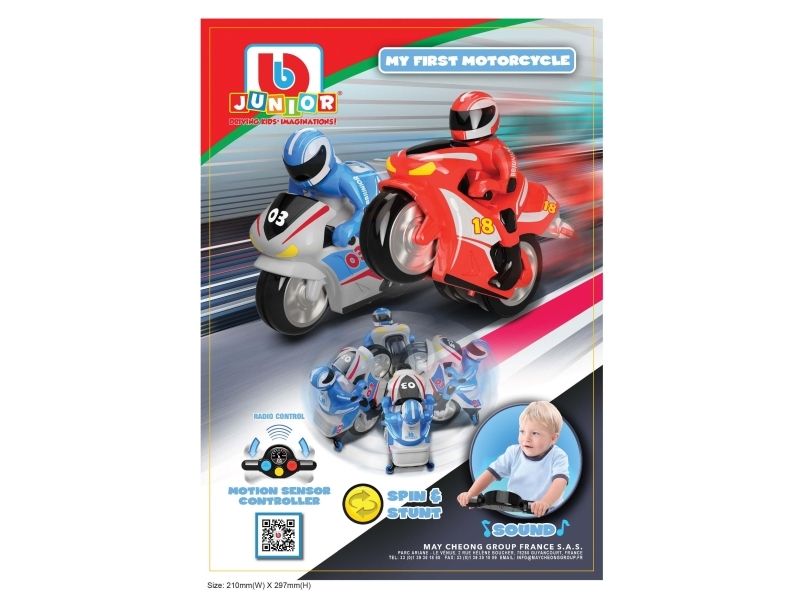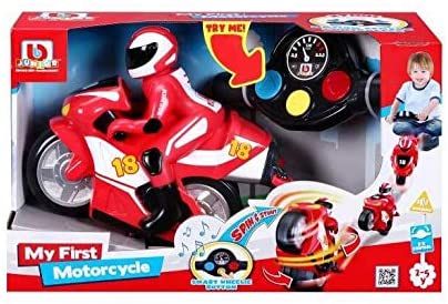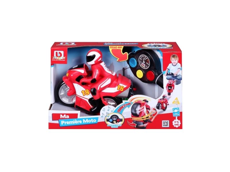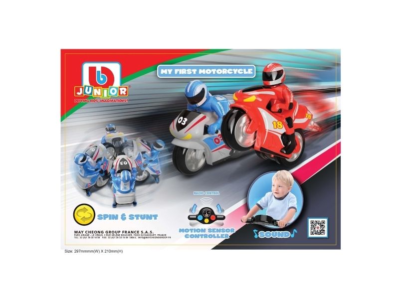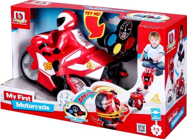 My First Motorcycle från BB Junior kommer att vara en säker succé hos alla små barn. Motorcykeln kan göra alla möjliga, häftiga tricks! Du styr bilen med fjärrkontrollen. Tryck på den gula knappen för att utföra tricks, den röda knappen för att svänga till höger och vänster, och den blå knappen för att köra fram och tillbaka. Dessutom kommer det också roliga ljud från motorcykeln. Passar från 2 till 5 år.