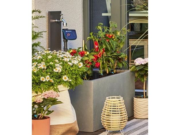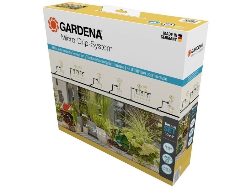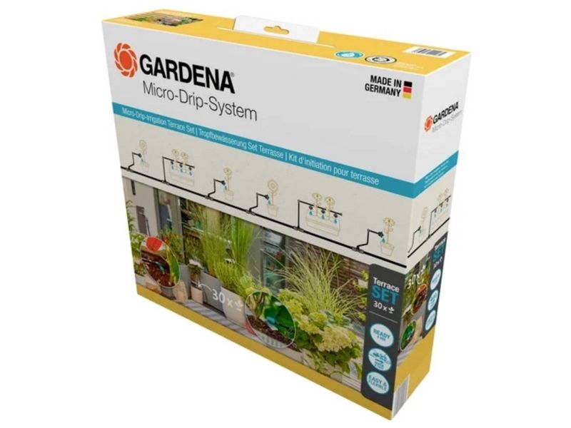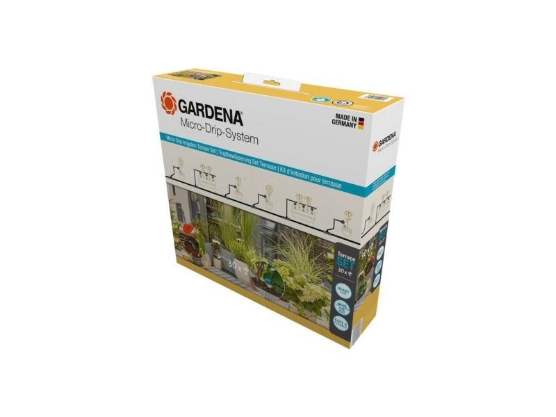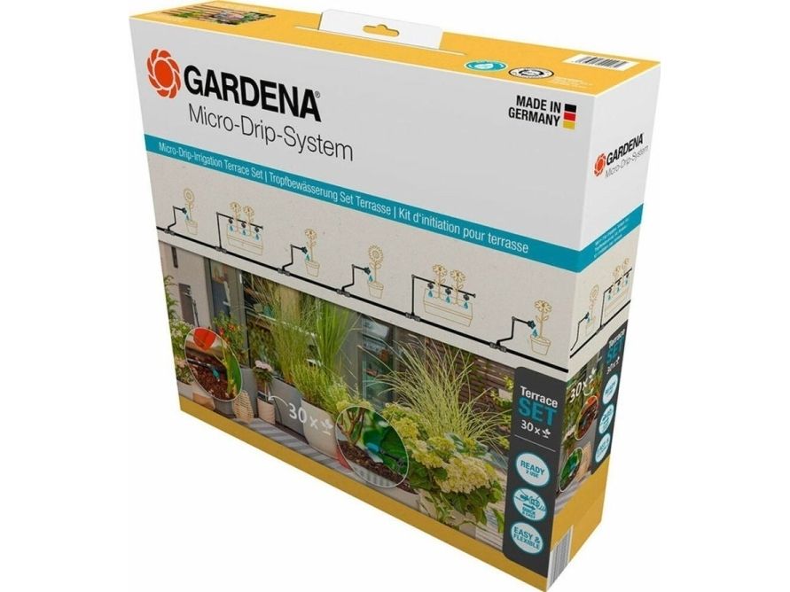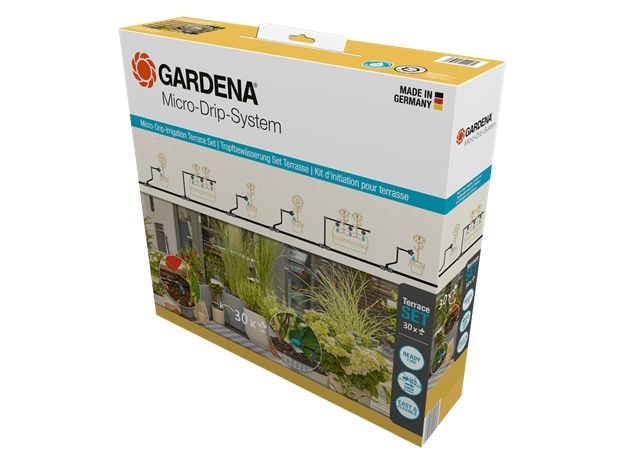 Micro-Drip-Irrigation Terrace Set från Gardena är lämplig för upp till 30 växter och kan användas direkt. Ready-2-Use-setet innehåller allt du behöver för vattenbesparande droppbevattning av enskilda krukväxter på terrassen med olika vattenbehov eller växter i planttråg och baljor. Det är enkelt att installera Micro-Drip-systemet: Anslut det till kranen, lägg ut rören och placera dropphuvudena bredvid växterna. Allt förklaras tydligt för dig i bara några få steg. MDS-komponenterna i setet är återanvändbara och därmed hållbara. Upptäck den patenterade Quick and Easy-anslutningstekniken för 13 mm-komponenterna och den unika Easy and Flexible-anslutningstekniken för 4,6 mm-komponenterna. Du kan enkelt ansluta dem, expandera dem flexibelt och ta bort dem igen. Startmodulen i Micro-Drip-systemet är Master Unit 1000, som reglerar vattentrycket från röret till ca 1,5 bar och matar ut det jämnt i de anslutna rören. Tack vare de olika dropphuvudena i setet har du dessutom möjlighet att individuellt anpassa vattenbehovet hos dina växter. De justerbara Endline dropphuvudena säkerställer optimal bevattning av växter med varierande eller ökande vattenbehov. Du kan justera vattenmängden till mellan 0 och 15 liter per timme. Mikro-droppsystem. Ta hand om dina växter och varje dyrbar droppe. Enkel, exakt, vatten- och tidsbesparande bevattning.
