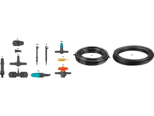Masterenhet 1000, rengöringsnål, 2 pluggar 13 mm (1/2"), anslutningsrör 13 mm (15 m), 5 rörklämmor, 13 mm (1/2 tum), matarrör 4,6 mm (20 m), 20 rörklämmor 4,6 mm (3/16 tum), 5 pluggar 4,6 mm (3/16"), 5 T-kopplingar 4,6 mm (3/16"), 3 avstängnings-/reglerventiler 4,6 mm (3/16"), 10 justerbara avslutande dropphuvuden (0-15 l/h), 20 dropphuvuden (2 l/h)