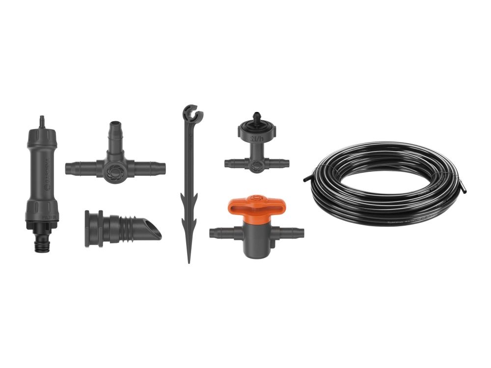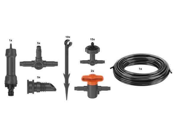 Masterenhet 1000, 10 rörklämmor 4,6 mm (3/16 tum), matarrör 4,6 mm (20 m), 5 pluggar 4,6 mm (3/16"), 2 avstängnings-/reglerventiler 4,6 mm (3/16"), 15 dropphuvuden (2 l/h)