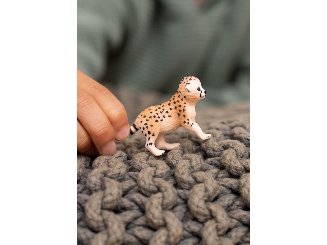 Den fräcka gepardbabyn är så söt med sina små pärlögon och svarta nos. Vid födseln väger den bara 300 gram, men vid det här laget har den redan hunnit växa. Du ser direkt att det är en gepardbaby på de typiska svarta fläckarna. Den lyfter lekfullt en tass – jag tror att den vill fånga något. Kanske ett löv som blåser i vinden? Eller har någon kastat till den en boll av ull?