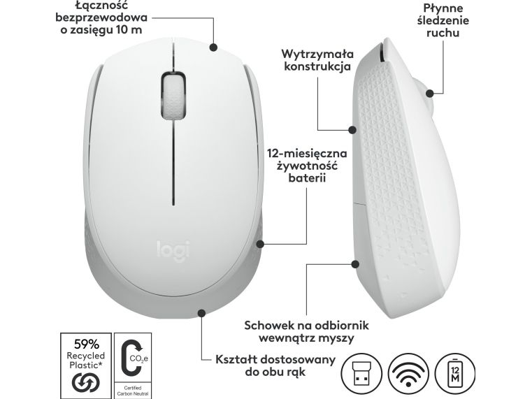 Logitech M171 - Mus - höger- och vänsterhänt - trådlös - 2,4 GHz - trådlös mottagare (USB) - Off-White