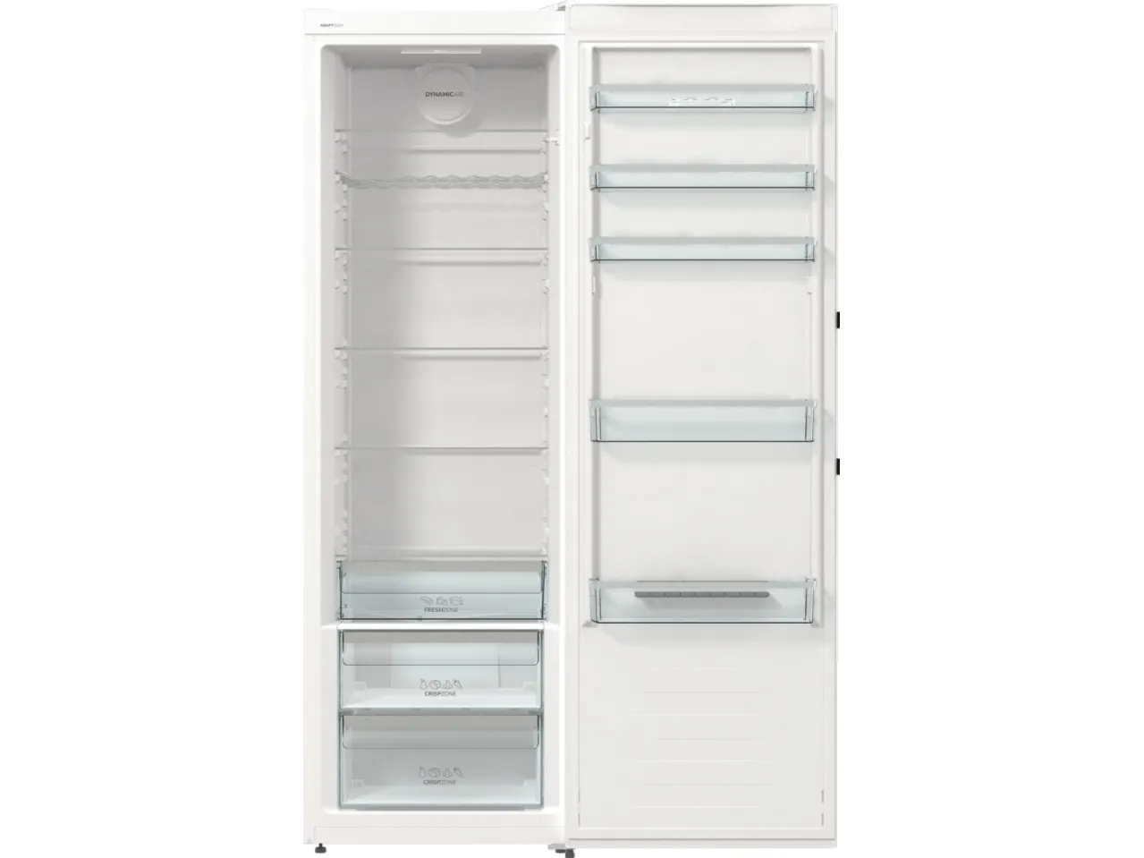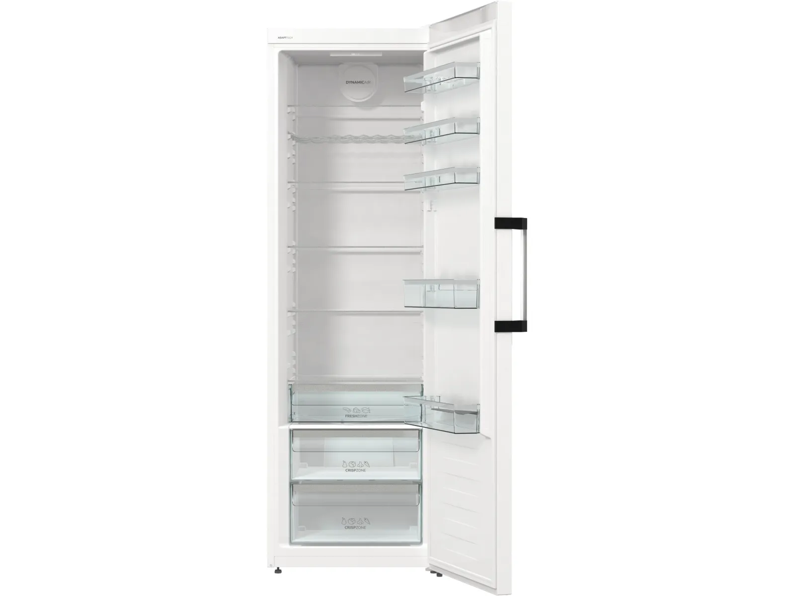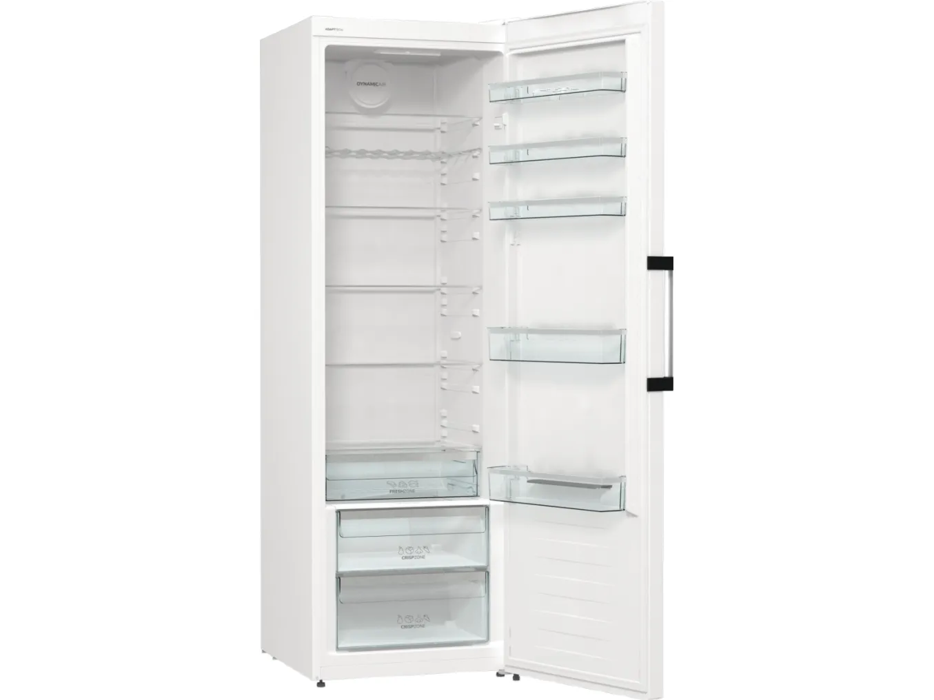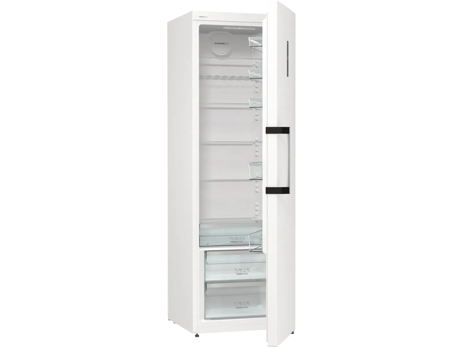 The Gorenje G600 R619EAW6 refrigerator offers a spacious total net capacity of 398 liters, making it a choice for families and individuals alike. Featuring a sleek LED display located on the door, all essential settings are easily accessible. This model is designed with energy efficiency in mind, consuming only 123 kWh per year, categorized under Energy Class E. The refrigerator is equipped with a dynamic cooling system and automatic defrost to ensure consistent conditions for food preservation. Interior elements include multiple adjustable glass shelves, a crisper drawer with humidity control, and ample door compartments for storage.