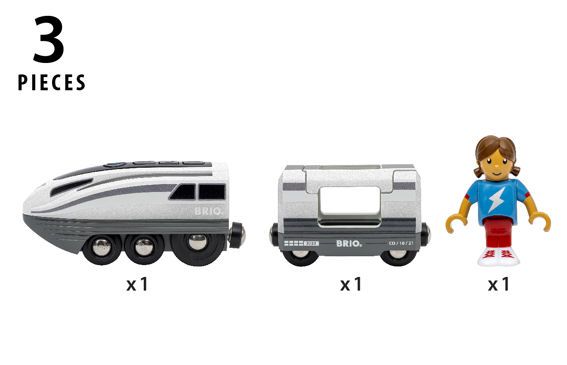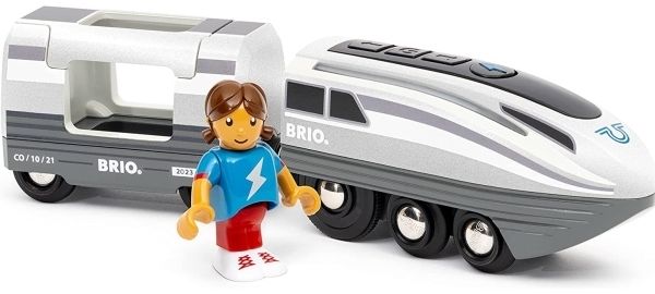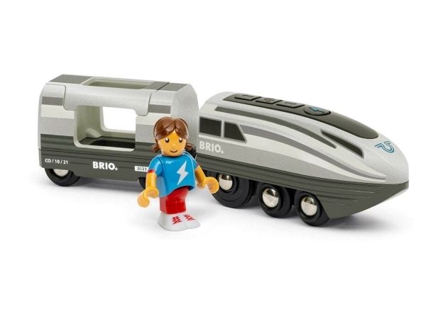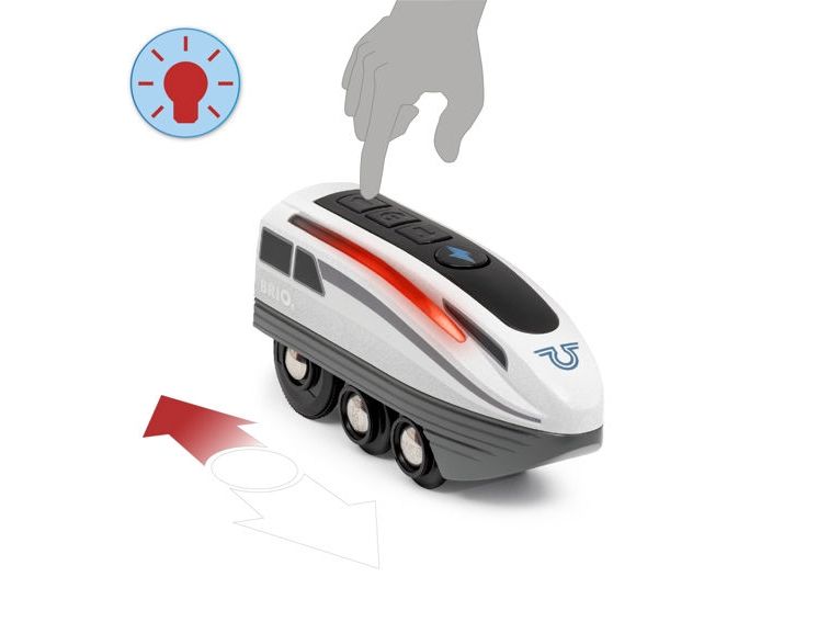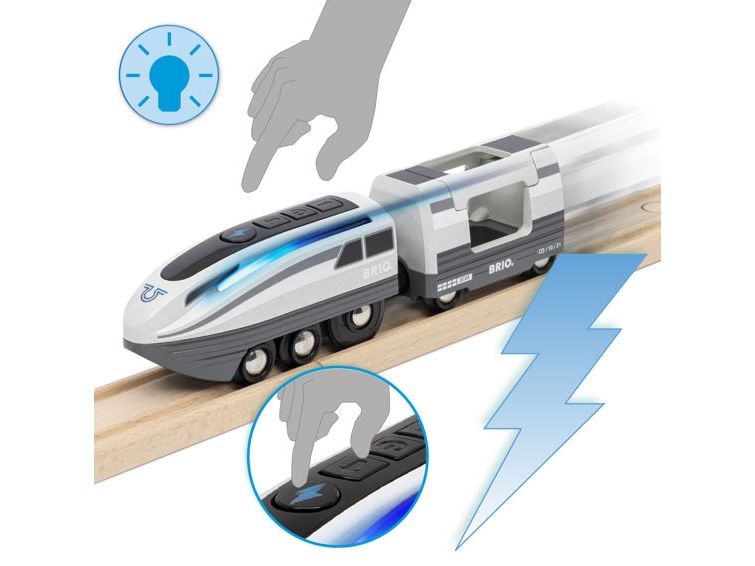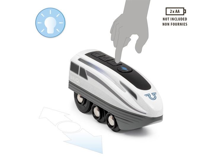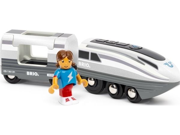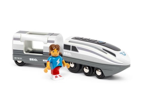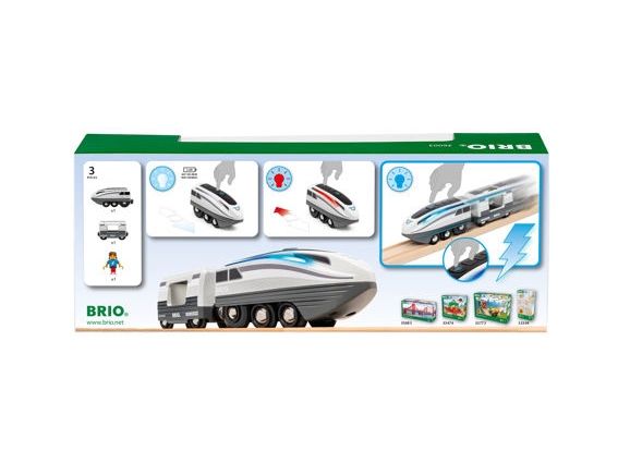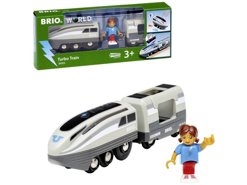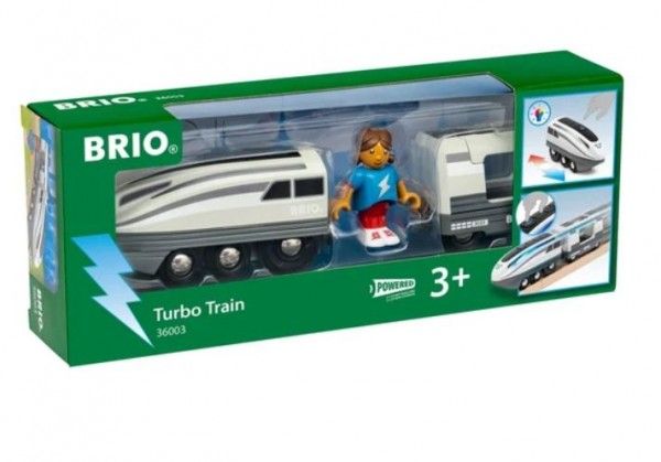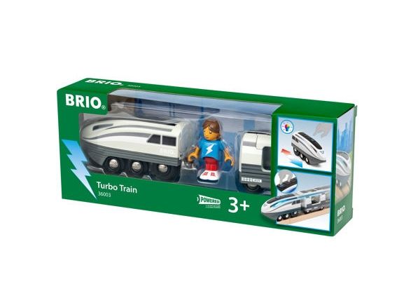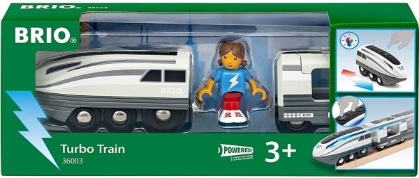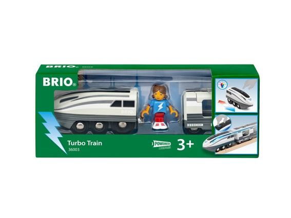 Öka farten med 36003 turbotåg. Tryck på den stora turboknappen så fördubblar det batteridrivna leksakståget sin hastighet – det snabbaste tåget i BRIO World. Turboeffekten varar i fem sekunder och när tåget körs i toppfart byter det vita ljuset längs sidorna färg och lyser istället med ett coolt blått sken. Detta futuristiskt utformade tåg innehåller också en passagerarvagn med tillräckligt med utrymme för en passagerare som får njuta av en spännande och minnesvärd resa.
