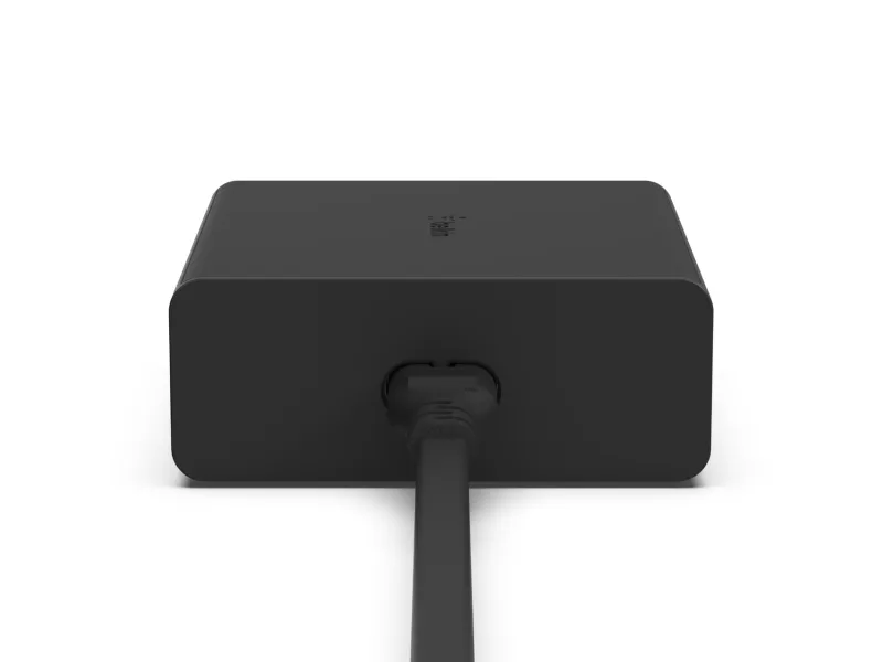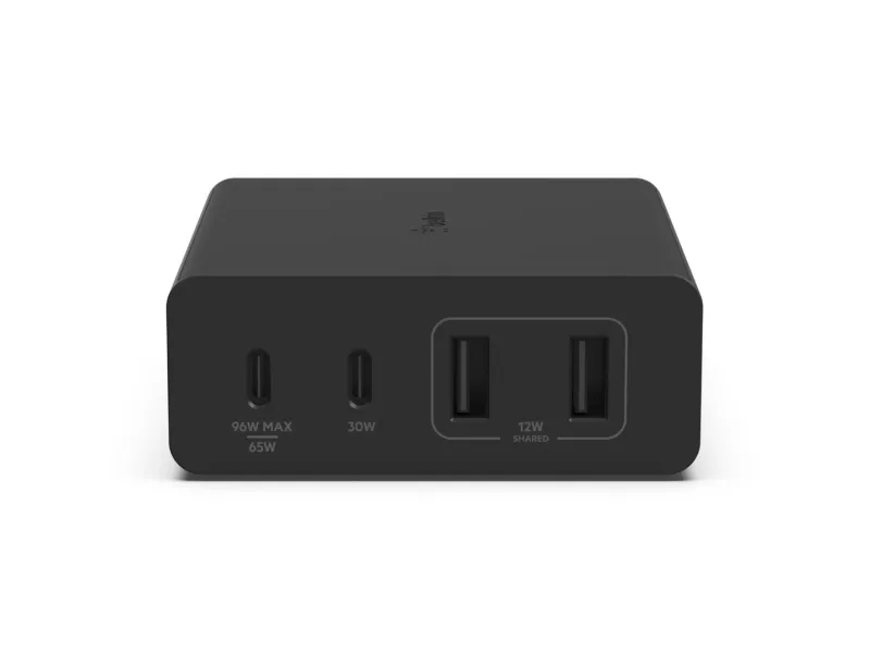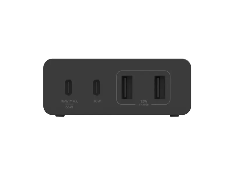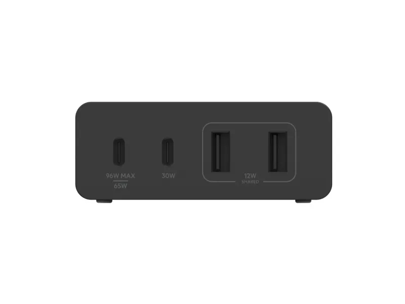 Access 2x USB-C and 2x USB-A ports to power the laptop and 3 additional devices with a 108 W 4-Port GaN Charger. It's packed with USB-C PD, GaN, and other technologies for a high-powered and efficient charge. Designed to sit on a desk for easy port access.