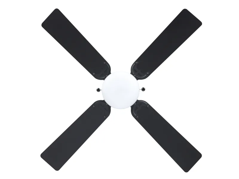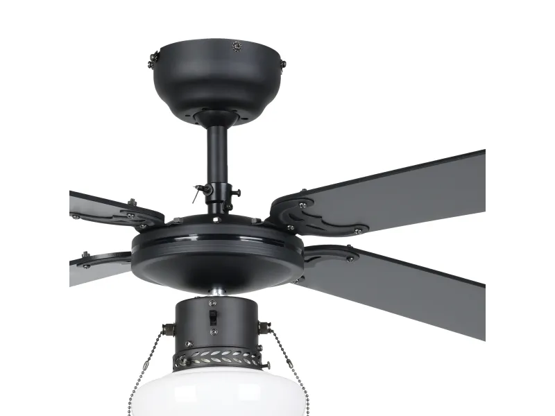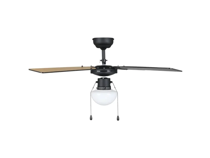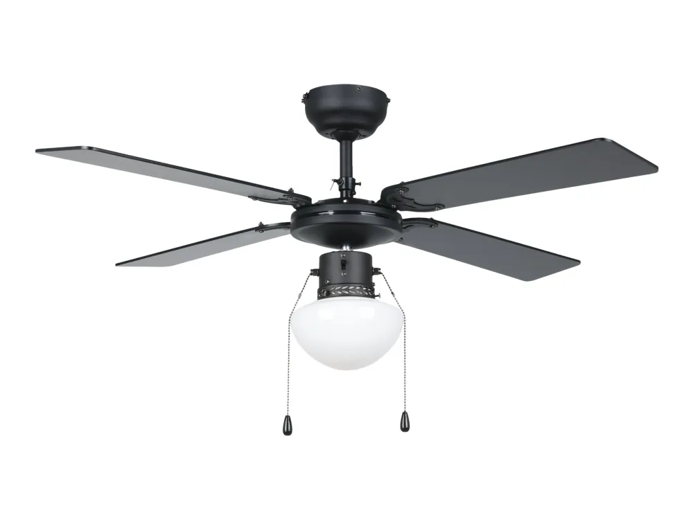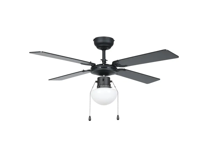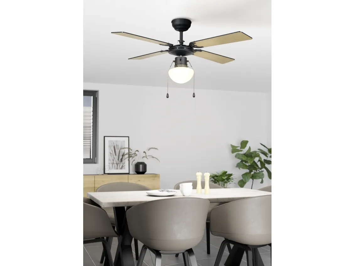 The Eglo FORTALEZA cooling fan with light is a sophisticated addition to any home or office, designed to offer both efficient cooling and ample lighting. This ceiling-mounted fan features a 106.6 cm diameter and four MDF blades, ensuring a wide coverage of cool air at a rotation speed of 235 rpm. With an airflow capacity of 6300 cu.m/h, it efficiently circulates air to maintain a comfortable environment. The fan also includes a lighting option with a pull chain for easy operation, supporting a 60 W light bulb in an E27 socket, providing both functionality and ambiance. Its three-speed settings allow for customizable comfort, catering to your cooling needs. Constructed from durable glass and steel, and adhering to IP20 compliant standards, the FORTALEZA is designed for longevity and reliability. Its sleek black blades and energy-efficient design, consuming only 44.8W at fan operation and featuring a low sound power level of 53 dB, make it an ideal choice for those seeking a blend of style, performance, and quiet operation.