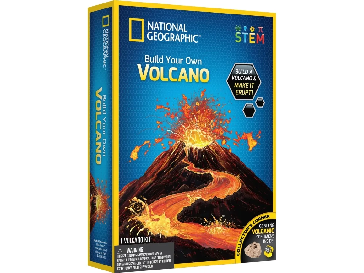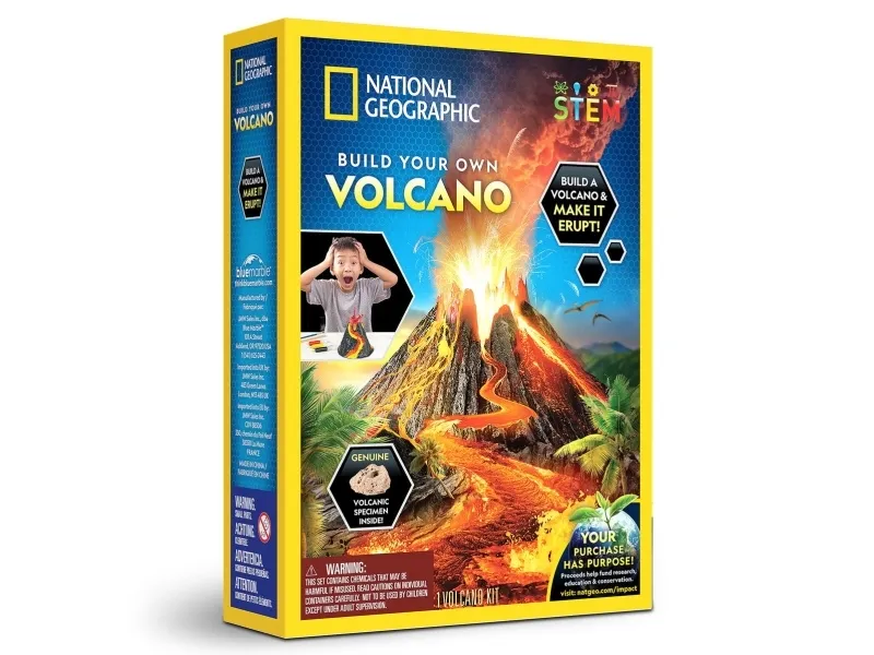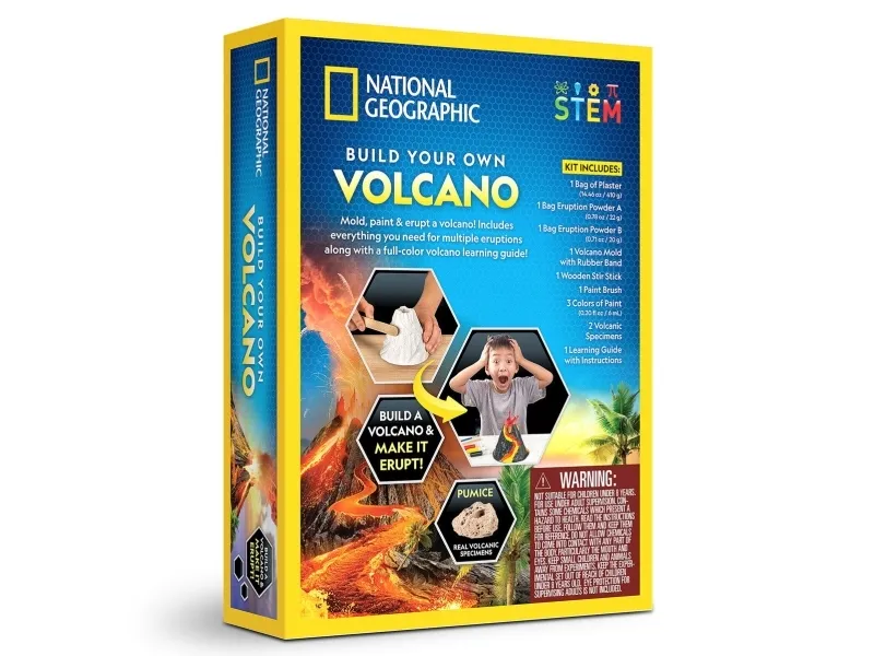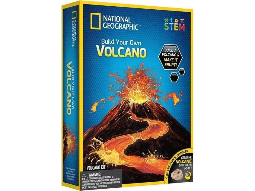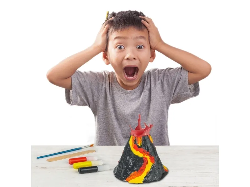 Bygg en vulkan och låt den få ett utbrott! Kitet innehåller: gips och vulkanform, färg och pensel, 3 vulkanprover, utbrottspulver, instruktions-guide