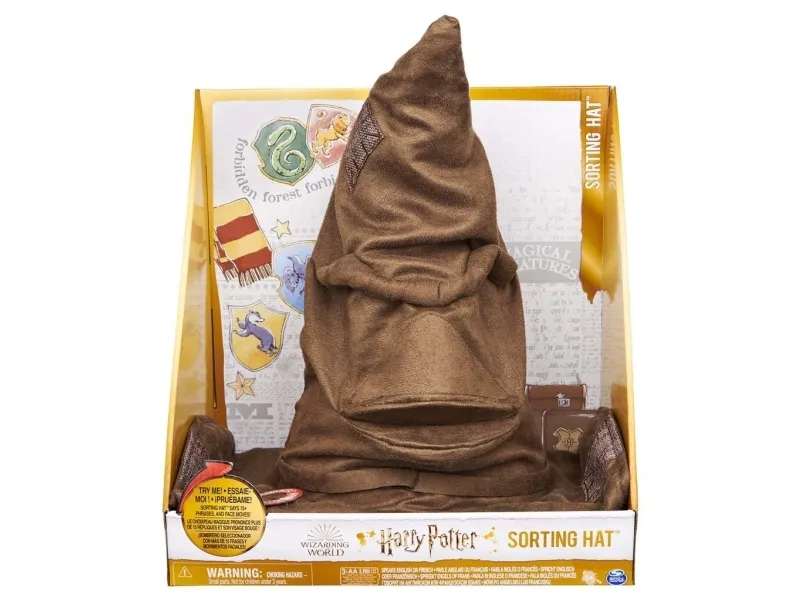 Find out your Hogwarts House with the talking Wizarding World Sorting Hat. With 15 phrases, authentic details and full facial movements, the Sorting Hat is a spellbinding way for young witches, wizards, and Muggles to recreate the iconic first-year Sorting Ceremony scene from Harry Potter. Place the hat on your head and the Sorting Hat will automatically respond. Its eyebrows, head and mouth will move as it determines and announces the Hogwarts House for the wearer. Will it pick Gryffindor, Ravenclaw, Hufflepuff or Slytherin? Press the button on the brim of the Sorting Hat to hear more phrases. Once your House is revealed, use your imagination to create your own Wizarding World adventures with the Harry Potter Wands (each sold separately). This enchanting Sorting Hat is a must-have gift for kids ages 5 and up. 3 AA batteries included. The Sorting Hat Speaks English and French – simply slide the switch to choose your preferred language. Bring home the Wizarding World Sorting Hat and discover your Hogwarts House.