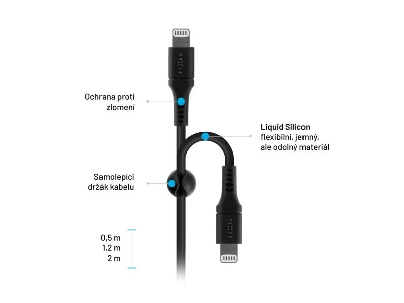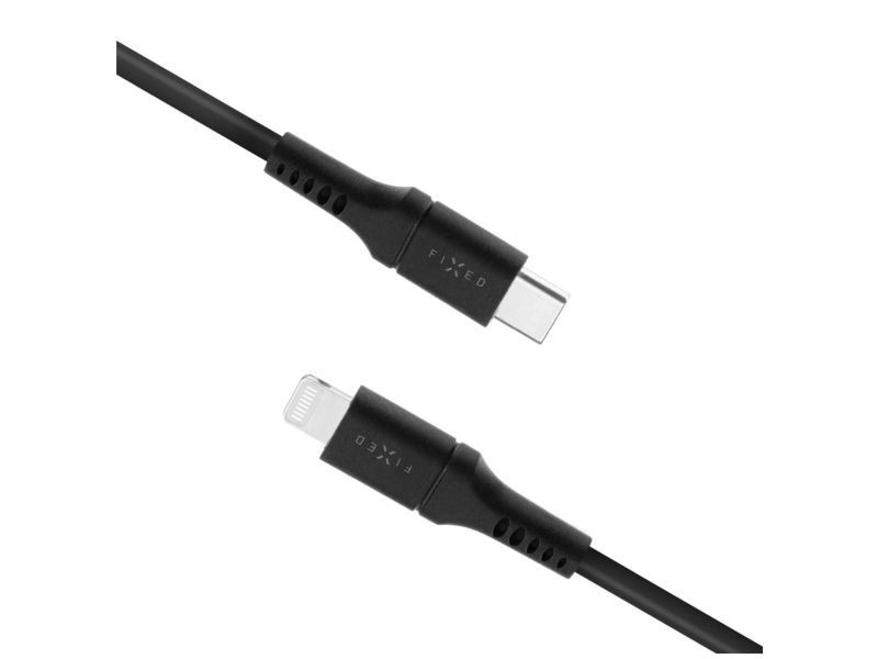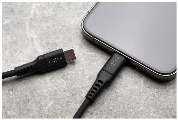 FIXED Lightning-kabeln är utformad för att förbättra anslutningsmöjligheterna och samtidigt säkerställa hållbarhet. Kabeln har en vänster USB-C-kontakt med 24 stift och en höger Apple Lightning-hankontakt och möjliggör höghastighetsdataöverföring på 480 Mbps, vilket gör den idealisk för effektiv laddning och synkronisering av enheter. Kabeln är konstruerad med ledare av förtennad koppar och täckt av ett silikonhölje, är trasselresistent och utrustad med vridningsskyddande egenskaper, vilket garanterar en längre livslängd. Med en strömförsörjning på 60 W uppfyller den MFi-certifieringsstandarder, vilket möjliggör säker laddning och datahantering på alla kompatibla enheter.