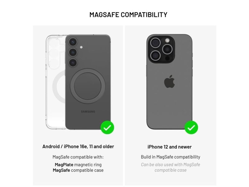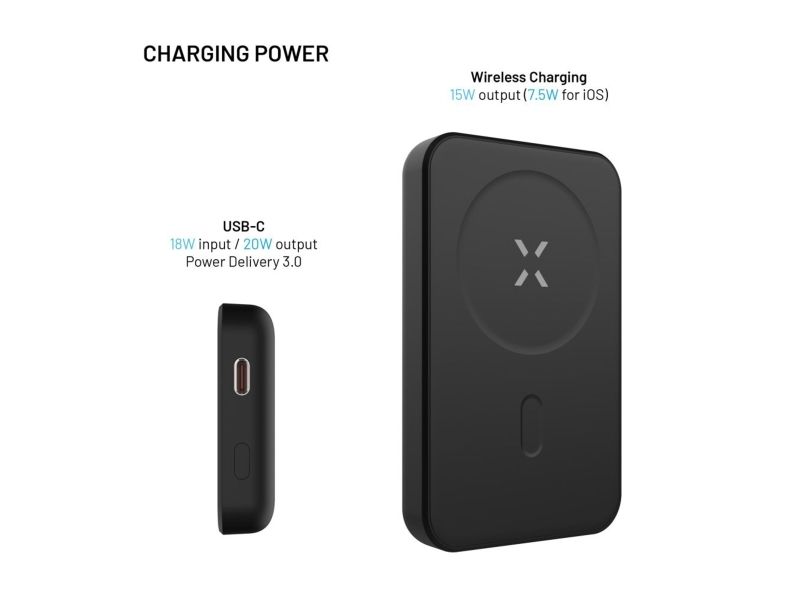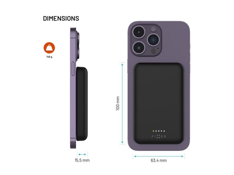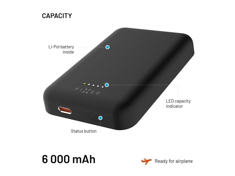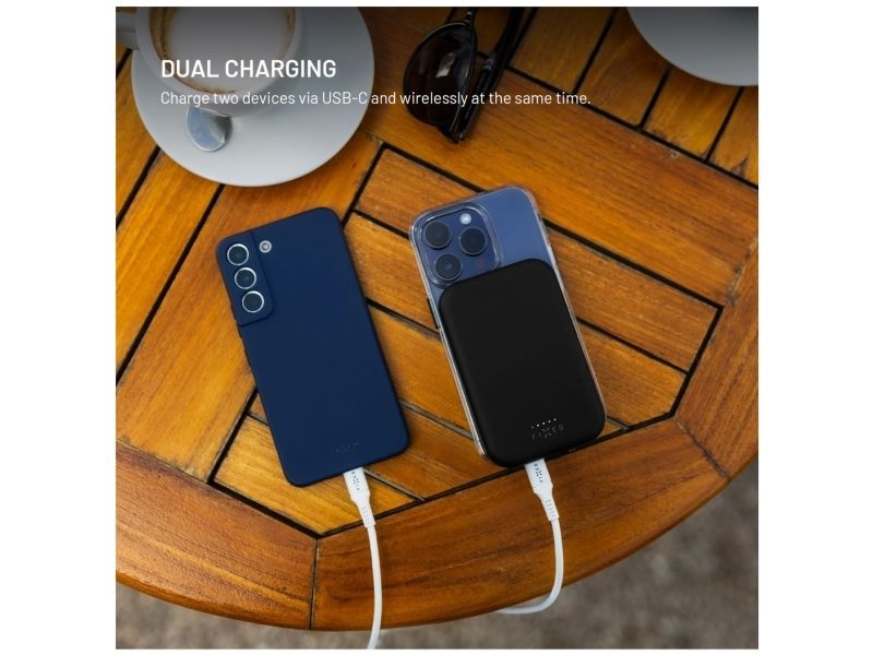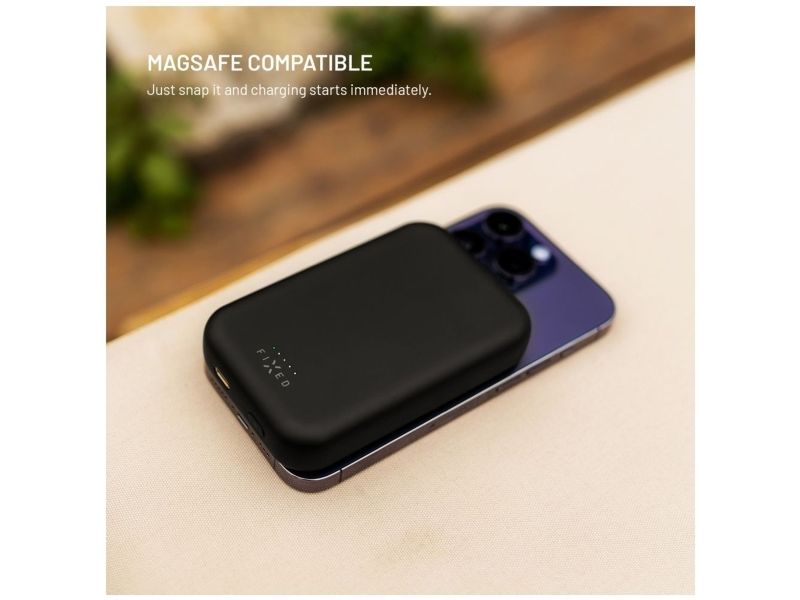 FIXED MagZen är utrustad med säkerhetsfunktioner som kortslutningsskydd, överhettningsskydd och överspänningsskydd och prioriterar användarens säkerhet under laddning. Dess 30 cm långa USB-C-kabel kompletterar den trådlösa laddningsfunktionen genom att möjliggöra samtidig laddning av upp till två enheter med en maximal effekt på 20 watt. En praktisk LED-batteriindikator gör det möjligt för användare att övervaka den återstående laddningen, vilket gör det till ett viktigt tillbehör för alla som är beroende av sina enheter när de är ute och reser.