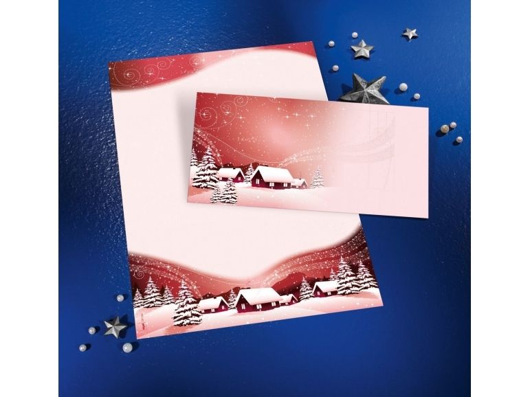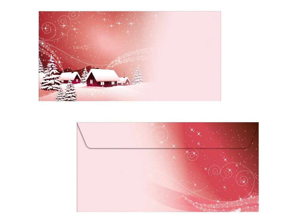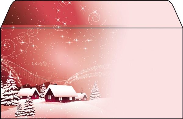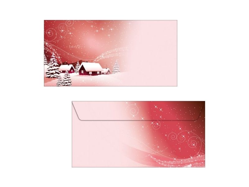 Christmas envelopes, "Silent Night", with a Christmas village motif on a red background, to go with the Christmas motif paper DP036. The gummed envelopes without a window can be printed with inkjet and laser printers and copiers. Box contents: 50 DL envelopes.